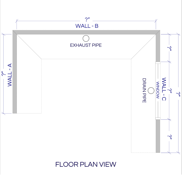 Elevation view of WALL B. we need to check the length of the wall, if there is an exhaust pipe, we need thedistance between the pipe and one side of the wall.
